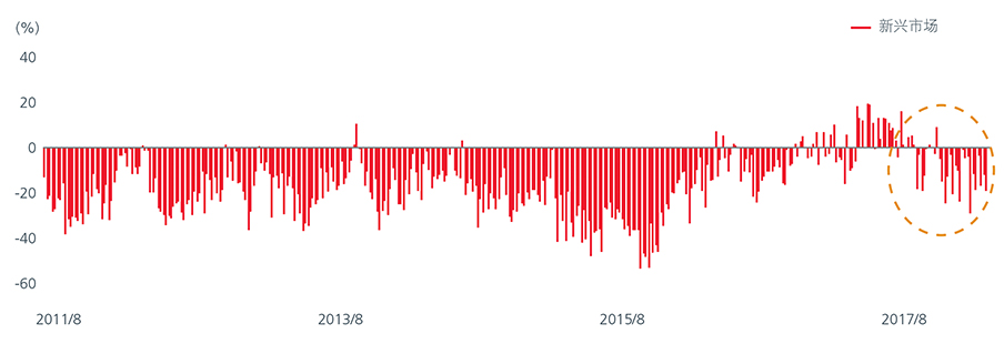 股息支付率更高的股票在长时间内跑赢大盘,有助于缓冲资本损失,在下跌市场尤其明显。在2008年和2011年的市场调整中,MSCI AC亚太(日本除外)高股息收益率指数分别优于MSCI亚太(日本除外)指数7.3%和10.7%。MSCI的研究显示,从1998年12月到2015年 8月,新兴市场的高股息收益型股票比发达市场的同类型股票表现更好,因为投资者认为稳定的收入是应对本地经济和货币风险的安全港5。