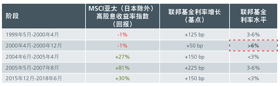在亚洲,我们将1999年以来美联储的加息周期分为五个不同的阶段(见图表3)。在这几个阶段中,联邦基金利率低于6%时,MSCI亚太(日本除外)高股息收益率指数取得了正回报(1999年5月至2000年4月互联网泡沫期间除外,当时其指数下跌了1%。)