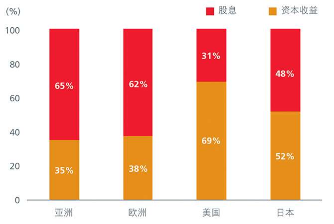 好消息是,亚洲公司一直在支付更多的股息。股息占亚洲股市2008年至2018年总回报的65%,高于前10年的39%(见图表4)。这一比例超过了发达市场,美国和日本的股息回报分别占总回报的是30%和48%。欧洲占62%,紧随其后,位居第二。