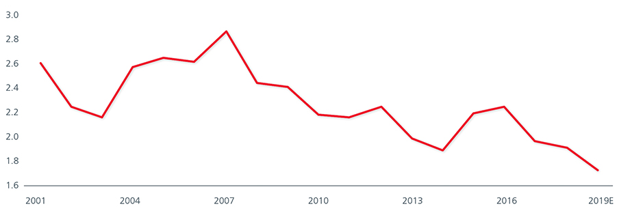 亚洲日益增加的股息是更强现金流和更健康资产负债表的结果。图表5显示了亚洲的净负债与息前税前及折旧摊销前盈余比从2001年的2.6:1下降到2017年的1.96:1。在此期间,亚洲股息每股增长了239%。亚洲的净负债与息前税前及折旧摊销前盈余比预计在进入2019年之际将进一步下降到1.7:7,股息前景似乎一片光明。综观净负债率,亚洲(日本除外)维持在29%,比发达市场的56%低得多。8