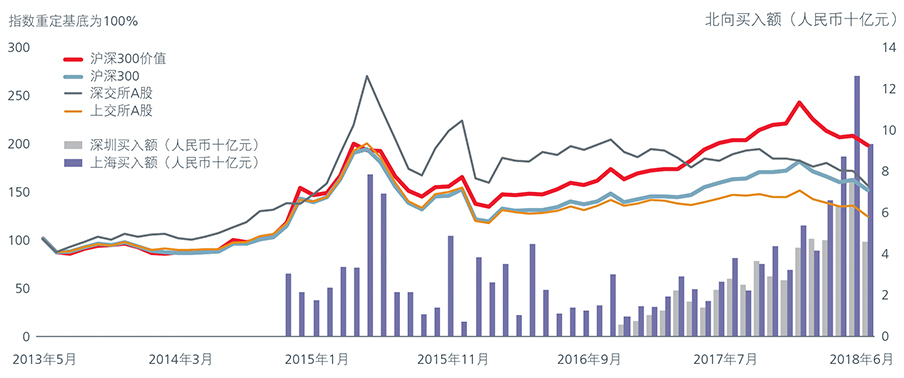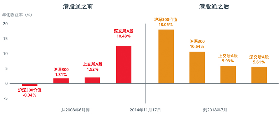 上证通的引入,使大盘A股自2016年11月以来一直有超越市场的表现2。该方案在2016年底覆盖深圳市场, 使外国投资者可以像交易香港上市的中国H股一样轻易地进行A股交易。