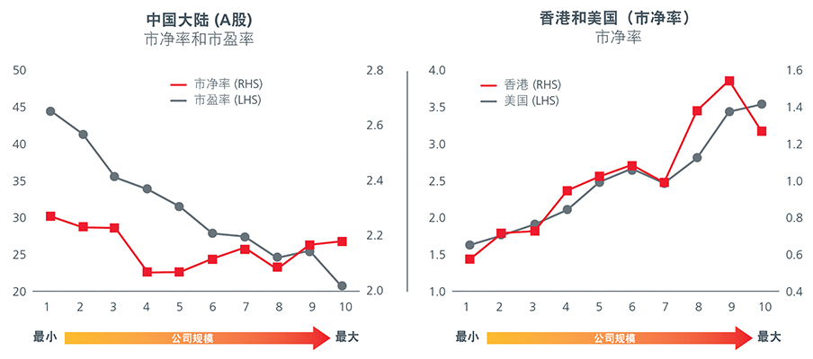 好消息是,尽管近年来表现强势,中国的A股大盘股较之小盘股(参见图4a)还属于低估值定价。这与香港和美国形成对照,他们的大盘股溢价交易(见图表4b)。